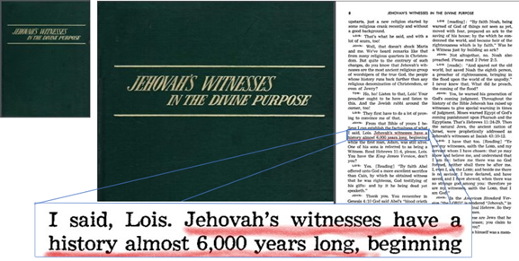 “Jehovas vittnen har en historia som är nästan 6000 år lång, … ” – Jehovas vittnen i Guds Uppsåt [1959] sidan 9 (engelska utgåvan) (Hittade ingen svensk utgåva av boken, utdraget är efter bästa förmåga direktöversatt)
