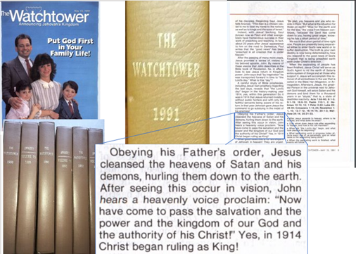 “I lydnad för sin Faders befallning rensade Jesus himlarna från Satan och hans demoner och slungade ner dem till jorden. När Johannes bevittnat denna händelse i en syn, hör han en röst från himmelen utropa: ”Nu har frälsningen och makten och riket, som tillhör vår Gud, och myndigheten, som tillhör hans Smorde, blivit en verklighet!” Ja, år 1914 började Kristus härska som kung!” – Vakttornet, 15 maj, 1991, sidan 9 (eng. & sve.)