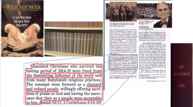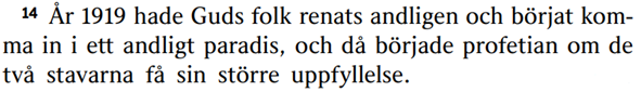 “De smorda kristna som hade bestått trosproven under perioden 1914–1919 lät sig inte längre behärskas av inflytandet från världen, och de hade befriats från många babyloniska sedvänjor. Kvarlevan av de smorda gick framåt som ett renat och luttrat folk och frambar villigt offer av lovprisning till Gud, förvissade om att de som folk betraktade var godtagbara för honom.” – Vakttornet, 15 maj, 1998, sidan 17 (sve. & eng.)