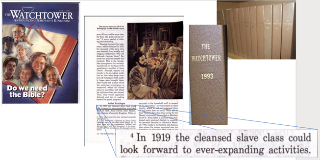 “Frågan gällde nu om mat hade satts fram, den rätta sortens mat och i rätt tid. Det var detta som måste utgöra grundvalen för det beslut som den återkomne husbonden skulle fatta. … … Då den regerande konungen Jesus Kristus inspekterade kvarlevan av sina smorda lärjungar år 1919 v.t., fann han den förordnade ”slaven” trogen och omdömesgill när det gällde att ge mat åt hans ”tjänstefolk”. Därför satte han denna ”slav”-klass över alla sina tillhörigheter.”– Guds tusenåriga rike har kommit nära [1973], sidorna 350 och 355 (sve. & eng.)