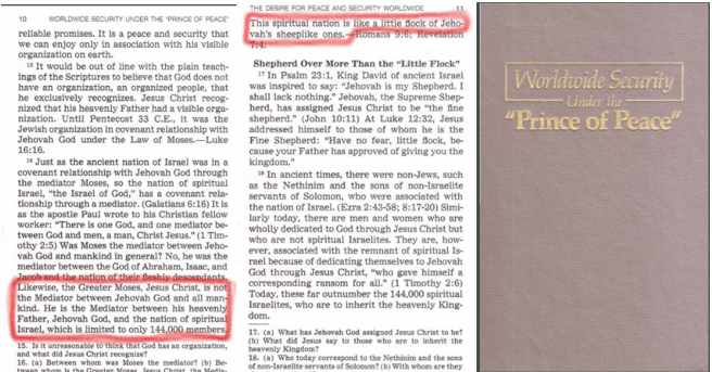 “På samma sätt är den större Mose, Jesus Kristus, inte medlaren mellan Jehova Gud och hela mänskligheten. Han är medlaren mellan sin himmelske Fader, Jehova Gud, och den andliga nationen Israel, som är begränsad till enbart 144,000 medlemmar. Denna andliga nation liknas vid en liten hjord av fårlika människor som tillhör Jehova.” – Världsvid säkerhet under “Fredens furste” [1986], sidorna 10–11 (eng. & sve.)