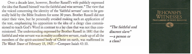 Mer än tio år senare gav emellertid broder Russells hustru offentligt uttryck åt uppfattningen att Russell själv var den trogne och kloke tjänaren. Bibelforskarna i allmänhet höll fast vid denna uppfattning om den trogne tjänarens identitet i omkring 30 år. Broder Russell avvisade inte deras uppfattning, men han undvek att själv göra en sådan tillämpning av skriftstället och betonade att han var emot tanken på att det skulle finnas en prästklass, som hade fått i uppdrag att undervisa i Guds ord, i motsats till en lekmannaklass, som inte hade fått ett sådant uppdrag. Den förståelse som broder Russell hade gett uttryck åt år 1881, att den trogne och kloke tjänaren i verkligheten var en kollektiv tjänare som utgjordes av alla medlemmarna av Kristi med anden smorda kropp på jorden, slogs på nytt fast i Vakt-Tornet för 15 april 1927.” – Jehovas Vittnen – Förkunnare av Guds Kungarike [1993/1994], sidan 143 (sve. & eng.)