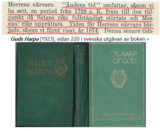“År 1943 utgav Sällskapet Vakttornet boken ”Sanningen skall göra eder fria” på engelska. I kapitel 11, som bar rubriken ”Tideräkning”, förkastades de inskjutna 100 åren under domartiden, och man rättade sig i stället efter den äldsta och mest autentiska lydelsen i Apostlagärningarna 13:20 och godtog de utskrivna sifferuppgifterna i de hebreiska skrifterna. Detta flyttade fram slutet av de sex tusen åren av människans tillvaro till 1970-talet. Därigenom förkastades naturligtvis också året 1874 såsom den tidpunkt då Herren Jesus Kristus återvände och hans osynliga närvaro eller parousia började.”– Guds tusenåriga rike har kommit nära [1973], sidorna 209–210 (eng. & sve.)