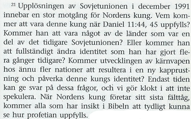 När Sovjetunionen upplöstes kunde Sällskapet Vakttornet inte bekräfta vem Nordens kung var. Jag [Paul Grundy] minns konversationer om att det kunde vara de islamiska staterna, eller Kina, båda som blev framträdande på världsscenen. Sällskapet Vakttornet försökte kväsa sådana spekulationer.