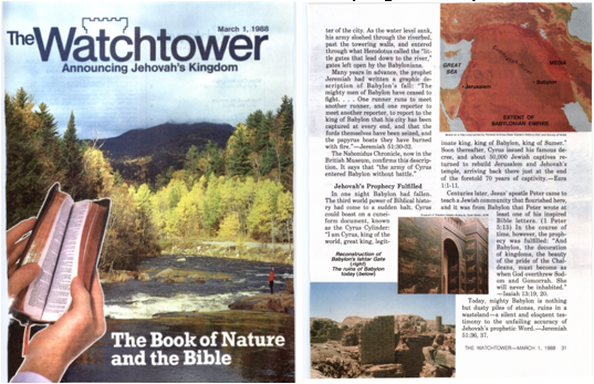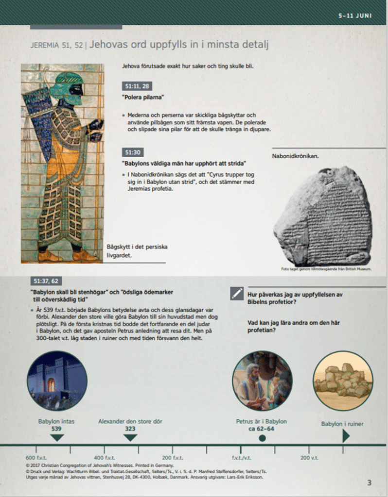 ”På 700-talet f.v.t. förklarade bibelskribenten Jesaja att Babylon – som först senare blev huvudstaden i ett mäktigt imperium – skulle besegras och att staden till slut skulle bli obebodd och öde. (Jesaja 13:17–20) … Blev Babylon obebott? Flera hundra år senare bodde det fortfarande människor där. Men i dag är Babylons ruiner, nära Bagdad i Irak, ett bevis på att profetian uppfylldes till punkt och pricka. Ja, Bibeln är pålitlig även när den behandlar framtida händelser.” – Vakttornet, Allmänna upplagan, Nr. 1 2020, sid. 8 (sve. & eng.)