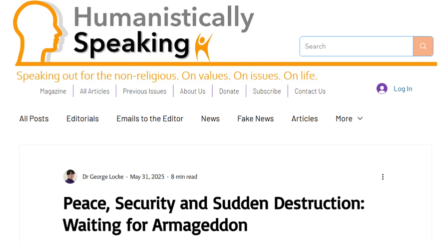 ”Vi tränades att se rubriker genom en eskatologisk lins, och filtrerade varje jordbävning, krig eller toppmöte som en potentiell indikator på slutet: kalla kriget; hålet i ozonskiktet; den katolska kyrkans utnämning av 1986 till ”Internationella fredsåret”; etiopisk hungersnöd och att ”ge världen föda”; och den nya miljörädslan för ”växthuseffekten”, tolkades alla som bevis på att världens undergång var nära.” (Direktöversatt) – https://www.humanisticallyspeaking.org/post/peace-security-and-sudden-destruction-waiting-for-armageddon Dr George Locke 2025