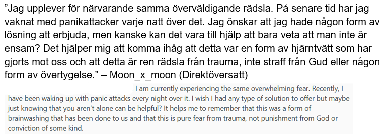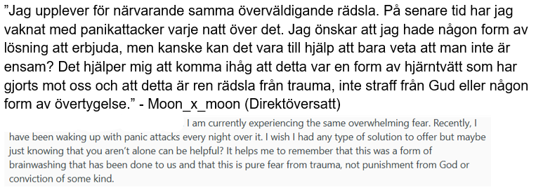 ”Religiöst trauma, ett psykologiskt fenomen som uppstår till följd av skadliga religiösa upplevelser, påverkar den psykiska hälsan avsevärt och leder ofta till tillstånd som ångest, depression, posttraumatiskt stressyndrom (PTSD) och minskad självkänsla. … Dogmatiska och auktoritära religiösa miljöer inför ofta strikta regler och rigida tolkningar av moraliskt beteende, ofta åtföljda av hårda straff för bristande efterlevnad. Dessa miljöer främjar rädsla och skam, vilket förstärker tron att avvikelse från föreskrivna normer är syndigt eller är värdigt straff. Som ett resultat kan individer internalisera dessa läror, vilket leder till en bestående känsla av skuld, självförebråelser och låg självkänsla. Denna internalisering kan orsaka emotionellt förtryck, eftersom individer kan känna sig oförmögna att uttrycka tvivel, rädslor eller alternativa synpunkter utan rädsla för utfrysning eller fördömelse (Ward, 2011). Med tiden kan den kumulativa effekten av att leva under sådana rigida system resultera i djup psykisk stress och trauma.” – https://transpersonal-psychology.iresearchnet.com/spirituality-and-religion/the-impact-of-religious-trauma-on-mental-health/ (Direktöversatt)