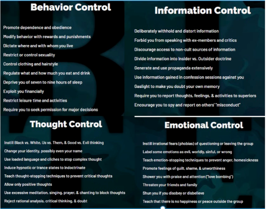 Jehovas vittnen utsätts för majoriteten av identifierarna i listan, och Hassans webbplats freedomofmind.com 2 augusti 2018 identifierar Jehovas vittnen som uppfyllande av dessa kriterier.