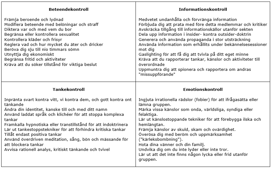 Manipulation: Sekter använder ofta manipulativa tekniker, såsom kärleksbombning (överdriven tillgivenhet och uppmärksamhet) eller rädslotaktik, för att kontrollera medlemmar.