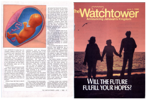 Det är troligt att det med tiden kommer utvecklas ett icke-blodalternativ med förmågan att ersätta blodets syrebärande egenskaper. Alternativt kan juridiska påtryckningar tvinga Sällskapet Vakttornet till att återgå till dess ursprungliga ståndpunkt och återigen tillåta blodtransfusioner som godtagbara. I båda fallen kommer blodtransfusioner att bli ett avlägset fördärv i Vakttornets historik. Men innan dess kommer Jehovas vittnen fortsätta att dö genom sin acceptans av Vakttornets rådande blodlära som Guds vilja, och förbruka miljontals dollar av skattebetalares pengar varje år för kraven på kostsamma alternativ utan blod och kämpa mot medicinska myndigheter i domstol.