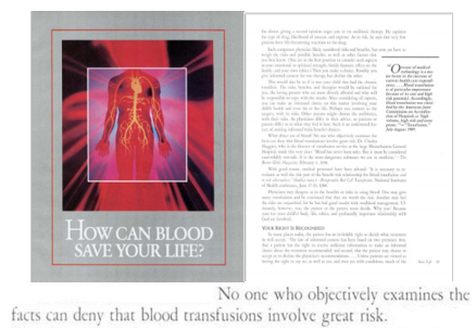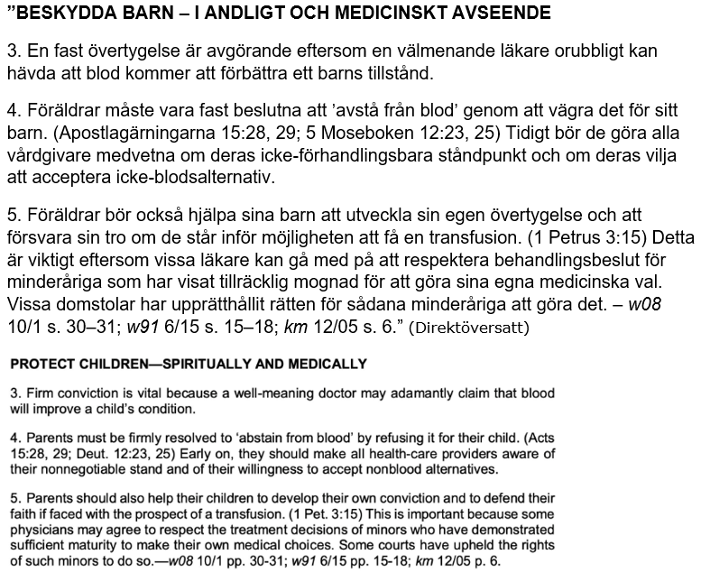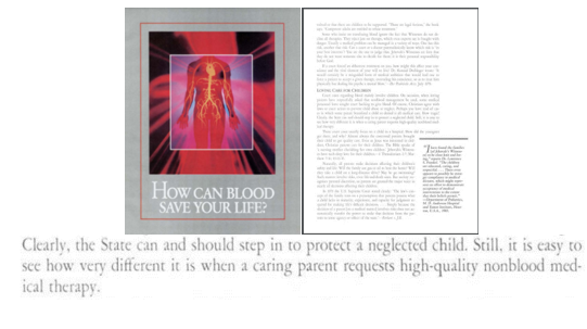 “Det är uppenbart att staten kan och bör gripa in för att skydda ett vanvårdat barn. Men det är lätt att inse hur helt annorlunda situationen är när en omtänksam förälder begär läkarbehandling av hög kvalitet, men utan blod.” – Hur kan blod rädda ditt liv? [1990], sid. 21 (eng. & sve.)