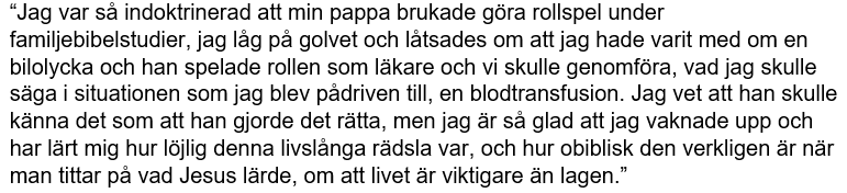 “Jag var tvungen att göra det svåra valet att antingen dö eller ta emot blod i höstas, och jag valde blod. Det var ingenting som sjukhusets kontaktkommitté kunde ha erbjudit en hållbar lösning för. Det krävdes 16 akuta transfusioner för att rädda livet på mig. När jag talade med de äldste blev det tydligen en fråga om huruvida jag var svag eller ogudaktig, och eftersom jag tog emot fler än bara en ansåg man det vara ogudaktigt. Jag har ingen aning om ifall de gav ett tillkännagivande i Rikets salen om att jag “inte längre är ett Jehovas vittne” … [men] till och med min mycket kära, älskade närmaste vän pratade aldrig med mig igen. Och krossade mitt hjärta.”