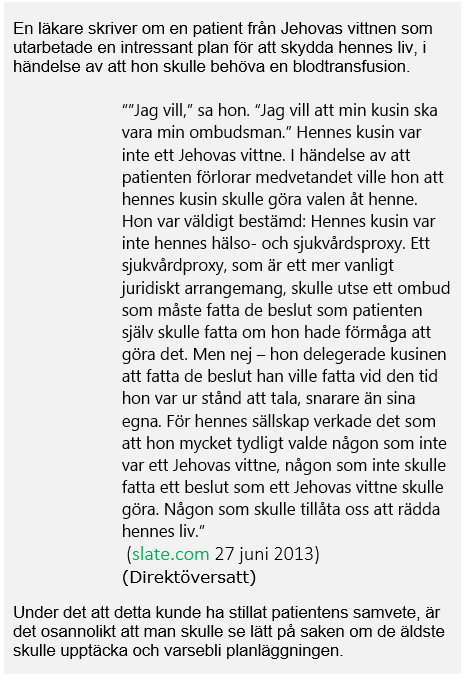 På samma sätt blev det uppgivet av en representant för Sällskapet Vakttornet år 1999, att; “Föräldrarna uppmanas inte till att samtycka till användning av blod, men de uppmanas att komma till klarhet om situationen enligt lag.” (Malyon, Transfusion-free treatment of Jehovah’s Witnesses: respecting the autonomous patient’s rights, Journal of Medical Ethics, 1998; 24:302–307) (Malyon, Transfusionsfri behandling av Jehovas vittnen: respekterande av den autonoma patientens rättigheter, Läkaretiksjournal, 1998; 24:302–307)