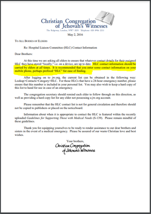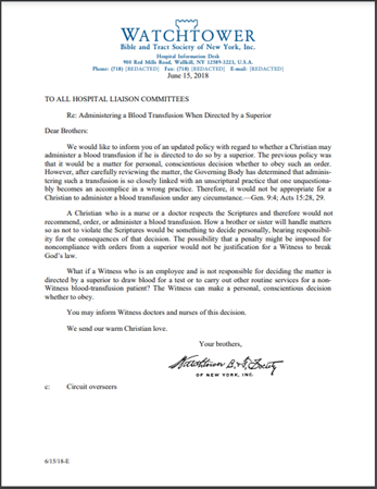 ”Vi skulle vilja informera dig om en uppdaterad policy med avseende på huruvida en kristen får ge en blodtransfusion om han uppmanas att göra det av en överordnad… En kristen som är sjuksköterska eller läkare respekterar bibelns skrifter och skulle därför inte rekommendera, ordinera eller ge en blodtransfusion.” – TILL ALLA SJUKHUSKOMMITTÉER, 15 juni 2018 (6/15/18-E) (Direktöversatt)