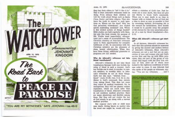 “Men antag att ens hustru eller barn var nära döden. Vem den anhörige än är skulle det fortfarande vara en överträdelse av Guds lag att ge blod. Man är inte fri att bryta mot Guds befallningar bara därför att man är nära döden. När man är nära döden är det inte tid att tumma på eller överträda Guds lag, utan då är det tid att komma Gud så nära som möjligt genom att förbli trogen. Evigt liv är belöningen för trohet. Hur dåraktigt skulle det inte vara att spela bort utsikten till evigt liv mot det mycket osäkra löftet om bot genom en blodtransfusion! — Upp. 2:10.” – Vakttornet, 15 oktober 1970, sidan 475 (sve.)- Vakttornet, 15 april 1970, sidan 249 (eng.)