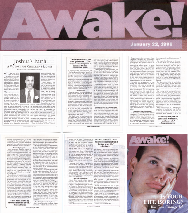 I en redaktionell artikel med rubriken ”En seger för underåriga” i Telegraph Journal kunde man läsa: ”Beslutet som New Brunswicks appellationsdomstol fattade om att den 15-årige Joshua Walker har rätt att samtycka till eller avböja medicinsk behandling är en seger inte bara för Jehovas vittnen, utan för oss alla. … Ibland verkar de beslut någon fattar vara för svåra för samhället att tolerera, i synnerhet om en ung persons liv står på spel. Men ännu svårare skulle det vara att tolerera ett samhälle som rutinmässigt kränker medborgarnas kropp och själ. Joshua Walker har gjort sin del för att vi skall slippa det.”