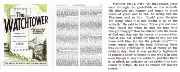 ”Matteus 12:1–4, NV: Vid den tiden tog Jesus och hans lärjungar vägen genom några sädesfält på sabbaten. Lärjungarna blev hungriga och började rycka av ax och äta. När fariséerna såg det sa de: ”Titta! Dina lärjungar gör något som är förbjudet på sabbaten.” Han svarade: ”Har ni inte läst vad David gjorde när han och hans män blev hungriga?” I dessa och följande verser uppmärksammade Jesus barmhärtighetshandlingar på sabbaten, och att det var helt rättmätigt att man visade barmhärtighet gentemot någon som är i nöd, även om det var under sabbaten, och att man, i själva verket, inte kränker sabbaten genom någon sådan handling. Han hade ingen förmaning för Davids sätt att handla.” (– Se även Markus 2:23-26) – Vakttornet, 15 september, 1952, sidan 575 (eng.) (Hittade ingen svensk upplaga av artikeln, utdraget är efter bästa förmåga direktöversatt)