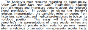 “Jehovas vittnen argumenterar inte för att blodtransfusioner inte har hållit patienter vid liv som annars skulle ha dött.” – Blod, medicin och Guds lag [1961], sidan 38 (eng.) (Hittade ingen svensk version av broschyren, utdraget är efter bästa förmåga direktöversatt)