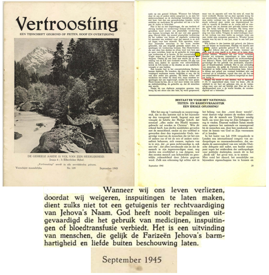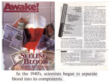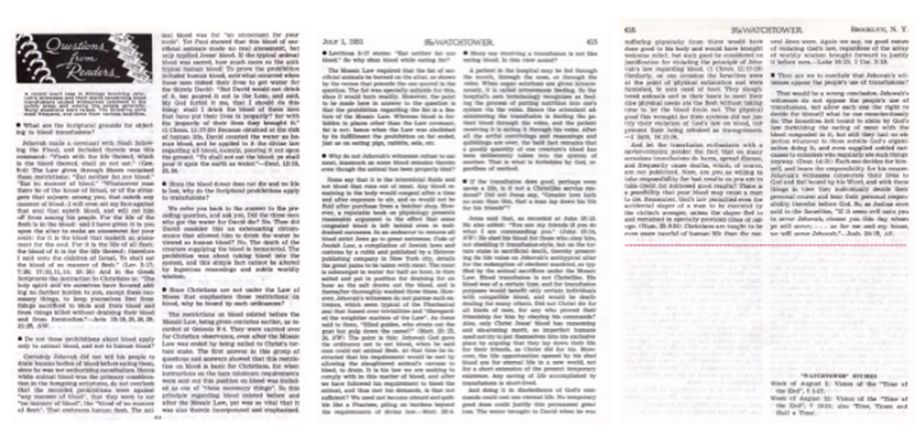 ”Jehovas vittnen tar därför inte emot transfusioner av helblod och inte heller av blodets fyra huvudkomponenter – röda blodkroppar, vita blodkroppar, blodplättar och blodplasma. De ger inte heller blod och låter inte lagra sitt eget blod för användning vid autolog transfusion.” – Tjänsten för Guds Kungarike, november 2006, sidan 3 (eng. & sve.) (Hittade ingen svensk upplaga av artikeln, utdraget är efter bästa förmåga direktöversatt)