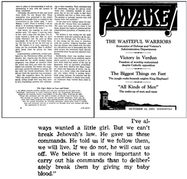 “Såsom Jehovas kristna vittnen såg hennes föräldrar, Darrell och Rhoda Labrenz rättfärdigt blodtransfusioner som ett brott mot Guds lag och motsatte sig det. De var oroliga över sitt barns eviga välgång, ty evigt liv är bara utsikten för dem som följer Guds lagar.” – Jehovas vittnens Årsbok 1975, sidan 223–224 (eng.) (Utdraget är direktöversatt efter bästa förmåga)