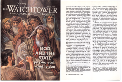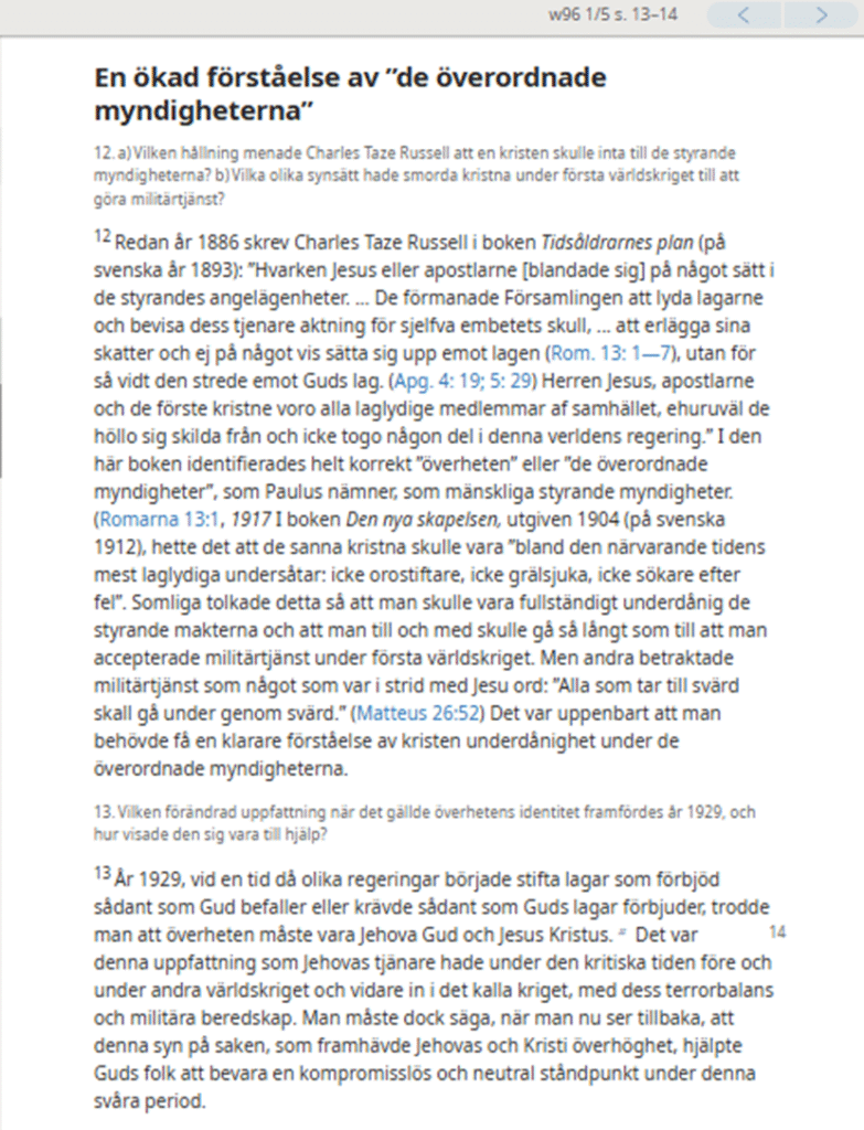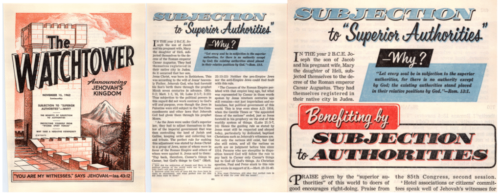 “Bibeln manar Jesu efterföljare till undergivenhet hänemot de makter som råder. (Romarna 13:1–7; 1 Petrus 2:13-17) Men samtidigt som de sålunda söker vara laglydiga i alla avseenden, skola kristna inse att det emellertid finnes en högre lag och en ännu högre Härskare, och att de skall vara underdåniga de världsliga makterna endast i avsaknad av en motsatt förmaning från den Högre Kraft – som tillkommer från Gud.” – Vakt Tornet, 15 januari, 1916, sid. 28–29 (eng.) (Ingen svensk upplaga av artikeln hittades, utdraget är efter bästa förmåga direktöversatt)