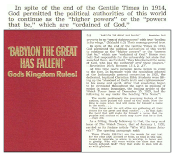 “Trots att slutet på hedningarnas tider skedde år 1914, lät Gud denna världens politiska auktoriteter fortgå som ’överhetens makter’, eller de ‘makter som finns’, som ‘av Gud är förordade’.” – Det stora Babylon har fallit! Guds rike härskar! [1963], sid. 548 (eng.) (Ingen svensk utgåva av boken hittades, utdraget är efter bästa förmåga direktöversatt)