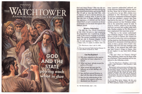 Flera år senare gjorde man på nytt en noggrann granskning av dessa verser, deras sammanhang och innebörd i ljuset av det som står i Bibeln för övrigt. Resultatet blev att man år 1962 erkände att ”de överordnade myndigheterna” är de världsliga styresmännen, men med hjälp av Nya Världens översättning kunde man klart urskilja principen om relativ underdånighet. Detta innebar ingen större förändring i Jehovas vittnens hållning till världsliga regeringar, men det korrigerade deras förståelse av ett viktigt textavsnitt i Bibeln. I denna process fick alla vittnen individuellt möjlighet att noggrant begrunda om de verkligen uppfyllde sina förpliktelser mot både Gud och de världsliga myndigheterna. Denna klara förståelse beträffande ”de överordnade myndigheterna” har utgjort ett skydd för Jehovas vittnen, i synnerhet i länder där stark nationalism och högljudda krav på större frihet har lett till våldsamheter och regimskiften.” – Jehovas Vittnen – Förkunnare av Guds rike [1993/1994], sid. 146–147 (eng. & sve.)