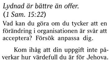 ”Och hur ska du reagera om det sker en förändring i organisationen som påverkar dig? Försök anpassa dig och följ vägledningen.”– Vakttornet, Studieupplaga, november 2022, sid. 25 (eng. & sve.)