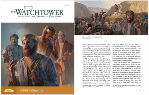 … när de kritiserade Mose kritiserade de faktiskt Jehova. De fokuserade inte på Jehovas vilja, utan på vad de själva ville ha – mer makt och myndighet. Jehova dödade dem som ledde upproret och även tusentals andra som hade ställt sig på deras sida. (4 Mos. 16:30–35, 41, 49) Vi förstår att Jehova fortfarande har samma syn på sådana som inte respekterar vägledningen från hans organisation.”– Vakttornet, Studieupplaga, juli 2024, sid. 11 (eng. & sve.)