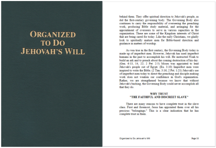 ”Det finns många skäl till att ha fullständig tillit till slavklassen. Först och främst har Jesus tillsatt dem över alla sina dyrbara ”ägodelar”. Detta är en tydlig indikation på att han har fullständig tillit till dem.” – Organiserade för att göra Jehovas vilja [2005], sid. 18 (eng.) (Ingen svensk utgåva av boken hittades, utdraget är efter bästa förmåga direktöversatt)
