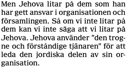 “Jehova använder ”den trogne och förståndige tjänaren” för att leda den jordiska delen av sin organisation. … De äldste i sin tur ser till att följa de anvisningarna i församlingen. Vi visar att vi litar på Jehovas sätt att hantera saker när vi följer de anvisningar vi får från organisationen och de äldste.” – Vakttornet, Studieupplagan, februari, 2022, sid. 4 (eng. & sve.)