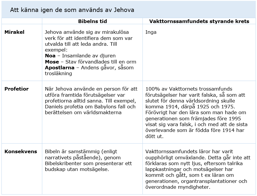 Den styrande kretsen visar inga tecken på konsekventa läror, eftersom de har betvingats till att presentera löpande förändringar av sin lära. De har en 100% felfrekvens när det gäller deras profetior eller förutsägelser om tidpunkten för denna världsordnings undergång. De kan inte heller utföra mirakel. Det finns inga bevismedel för att de är Guds talesmän, eller att de används av honom.