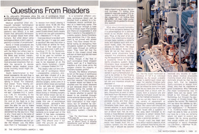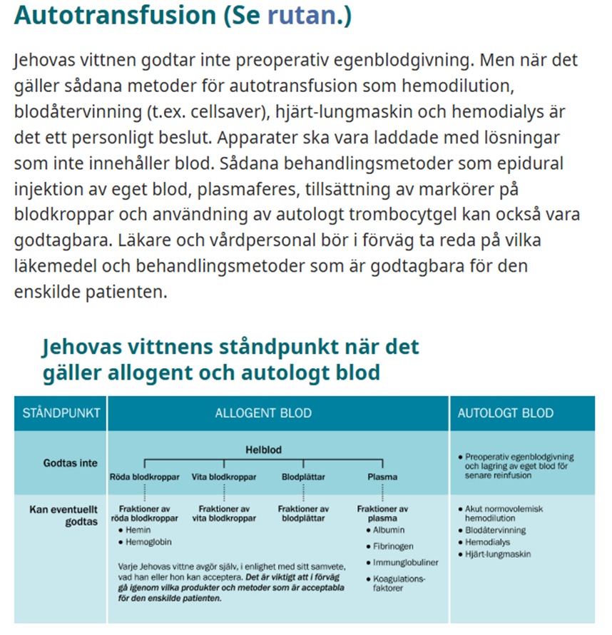 ”Detta utesluter uppenbarligen en vanlig användning av autologt blod — att man före en operation tappar av något av patientens eget blod och lagrar detta för senare bruk. Det man gör vid en sådan procedur är följande: Före det aktuella ingreppet lagras en viss mängd helblod från patienten i en blodbank, eller också avskils de röda blodkropparna och förvaras i fryst form. Om patienten sedan skulle behöva blod under operationen, kan hans eget lagrade blod tillföras honom. Den oro som många nu känner för blodburna sjukdomar har gjort detta bruk av autologt blod populärt. Jehovas vittnen godtar emellertid INTE denna behandlingsmetod. Vi har länge insett att sådant lagrat blod förvisso inte längre är någon del av individen. Det har blivit fullständigt avlägsnat från honom och bör därför undanskaffas på ett sätt som är i linje med Guds lag: ”Du skall hälla ut det på jorden som vatten.” — 5 Moseboken 12:24.”– Vakttornet, 1 mars 1989, sid. 30 (eng. & sve.)