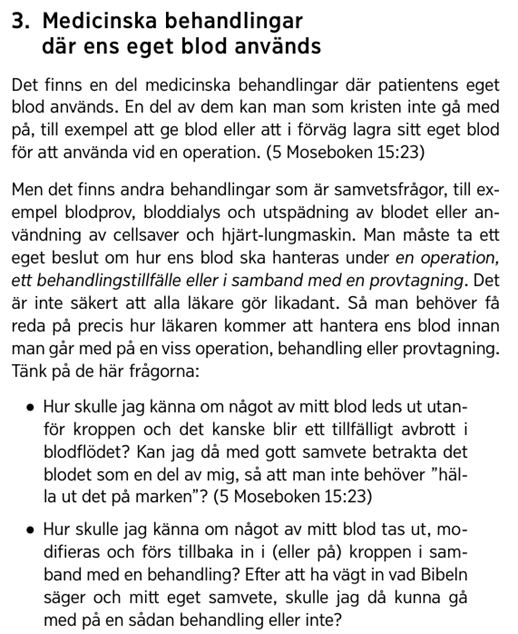 ”… finns … inte något bud i bibeln som direkt förbjuder att man tar emot vävnad från någon annan människa. … Det är en angelägenhet, där man måste fatta ett personligt beslut.” – Vakttornet, 15 juni 1980, sid. 31 (sve.) – Vakttornet, 15 mars 1980, sid. 31 (eng.)