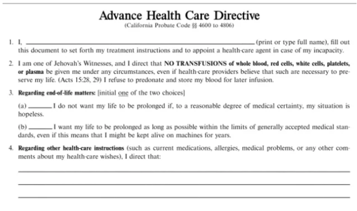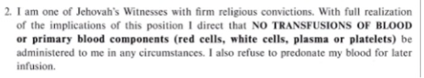 Det förhandsdirektiv för hälsovård som Jehovas vittnen är instruerade att bära med sig bekräftade deras vägran att lagra blod.