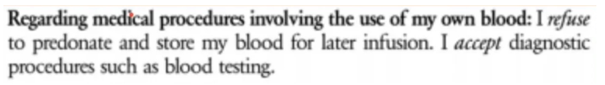 “Jag vägrar att donera blod i förväg och lagra det för senare infusion/tillförande.” USA