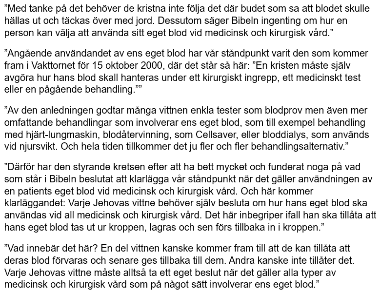”Men oavsett om det gäller helblod eller någon beståndsdel av blod och vare sig blodet tagits från ens egen kropp eller från någon annans, vare sig det införs som en transfusion eller genom insprutning, så gäller Guds lag. … Det är förbjudet att använda det som föda. Gud har inte bemyndigat att man överför blod från en person till en annan person under förklädnaden av medicinsk behandling för att vidmakthålla livet.” – Vakttornet, 1 mars 1962, sid. 105, 106 (sve.) – Vakttornet, 15 september 1961, sid. 559 (eng.)