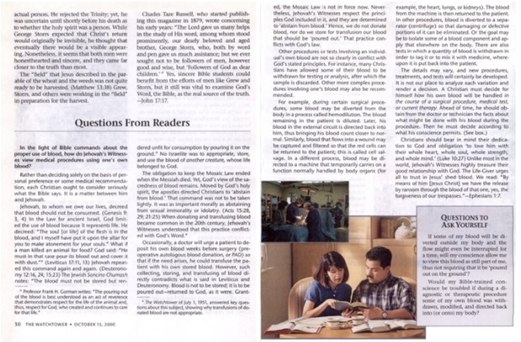 I Vakttornet,15 november 1951, sidan 526-527 i svenska upplagan, eller Vakttornet, 1 juli 1951, sidan 414 i engelska upplagan gavs det ut i Frågor från läsekretsen den första detaljerade diskussionen om Sällskapet Vakttornets bloddoktrin efter ett rättsfall som involverade Jehovas vittnen.