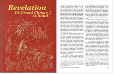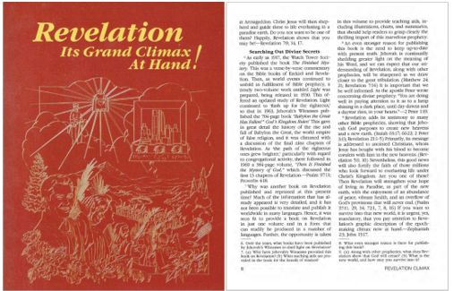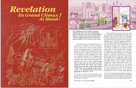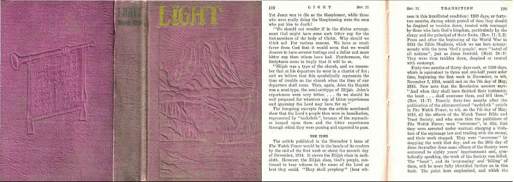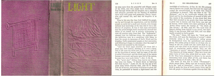 ”Redan år 1917 publicerade Sällskapet Vakttornet boken Den fullbordade hemligheten. Den var en kommentar vers för vers av bibelböckerna Hesekiel och Uppenbarelseboken. Längre fram, när världshändelserna hade fortsatt att rullas upp i uppfyllelse av bibelns profetior, utarbetades ett tidsenligt bokverk i två band med titeln Ljus, vilket offentliggjordes år 1930 (på svenska år 1931 och 1932). I det gavs en reviderad förklaring till Uppenbarelseboken. Ljus fortsatte att lysa fram ”för den rättfärdige”, vilket medförde att Jehovas vittnen år 1963 utgav den 704-sidiga boken ”Babylon the Great Has Fallen!” God’s Kingdom Rules! (På svenska utgavs boken år 1972 i en förkortad version om 256 sidor med titeln ”Det stora Babylon har fallit!” Guds rike härskar!)” – Uppenbarelsens storslagna höjdpunkt är nära! [1988], sid. 8 (eng. & sve.)