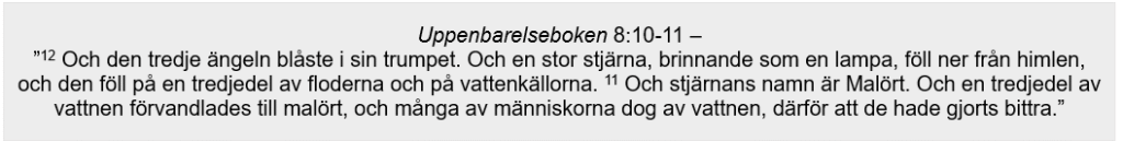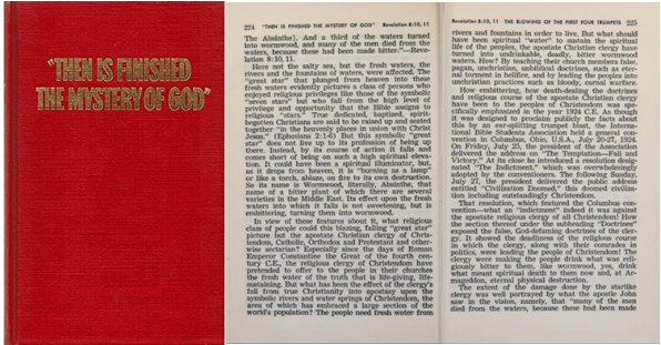 ”Med tanke på dessa utmärkande drag om det, vilken religiös klass av människor skulle denna flammande, fallande ’stora stjärna’ kunna förebilda förutom kristenhetens avfallna kristna prästerskap, katoliker, ortodoxa och protestanter och i övrigt sekterister? … Men vad som borde ha varit andligt ’vatten’ för att uppehålla folkens andliga liv, har det avfallna kristna prästerskapet förvandlat till odrickbart, dödligt, bittert malörtsvattens falska, hedniska, okristna, obibliska läror.” – Då är Guds hemlighet fullbordad [1969], sid. 224, 225 (eng.)