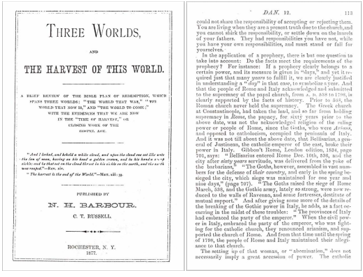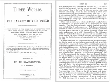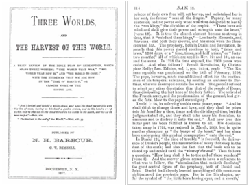 ”Om en profetia uppenbarligen tillhör en viss makt, och dess mått bleve angivet i ”dagar”, och ändock det togo så många år att uppfylla den, äro vi helt klart berättigade att förstå en ”dag” i det fallet, till att symbolisera ett år. Och att folket i Rom och Italien erkände och underkastade sig den påvliga kyrkans överhöghet, alltifrån 538 e.Kr. till 1798, klarligen stöds av historiens fakta.” – De tre världarna och denna världens skördetid [eng. The Three Worlds and the Harvest of this World] [1877], sid. 113 (eng.)