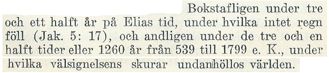 “Profetian, i bådadera Daniel och Uppenbarelseboken, kräver att denna makt skola fortgå att vidhålla, ”tider och lagar”, 1260 dagar, eller en ”tid, tider och en halv tid” eller ”fyrtiotvå månader” tillhopa; av vilka används i Upp. 12: och 13:, såsom ett och samma. 1798 gingo tiden till ända och de 1260 åren upphörde.” – De tre världarna och denna världens skördetid [1877], sid. 114 (eng.)