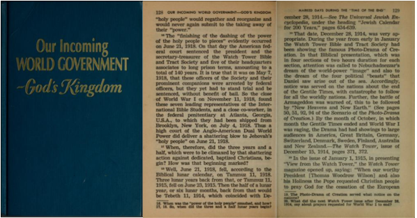 ””Söndrandet av det heliga folkets makt” avslutades tydligen den 21 juni 1918. Den dagen dömde den amerikanska federala domstolen Sällskapet Vakttornets president och sekreterare-kassaförvaltare och fem av deras medarbetare vid högkvarteret till långa fängelsestraff, som sammanlagt uppgick till 140 år. … Den 21 juni 1918 inföll enligt den bibliska månkalendern den 11 Tammus 1918. Tre månår tillbaka i tiden för oss till den 11 Tammus 1915, som inföll den 23 juni 1915. Ytterligare ett halvt månår eller sex månmånader bakåt i tiden inföll den 11 Tebet 1914, vilket sammanföll med den 28 december 1914. … Detta datum, den 28 december 1914, var mycket passande. Under årets lopp, från början av januari, hade Sällskapet Vakttornet visat det berömda Skapelsedramat i bilder.” – Vår tillträdande världsregering – Guds rike [1977/1978], sid. 126–127 (sve.), sid. 128–129 (eng.)