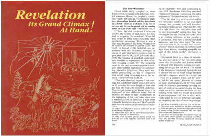 Nya böcker som förklarar Uppenbarelseboken har blivit nödvändiga för att ersätta tidigare felaktiga uttolkningar. Till och med den senaste Uppenbarelsens-boken innehåller ännu idéer som är uppenbart felaktiga och som kommer att behöva ändras igen med tiden. Antalet kontradiktoriska uttydningar som Sällskapet Vakttornet har presenterat visar att dessa är lite mer än en uppskattning och ett slag i luften, inte en samling läror som vägleds av Guds heliga ande. Hur förklarar organisationen en så pass stor omskrivning av de profetiska förklaringarna? Uppenbarelsens storslagna höjdpunkt är nära! anger på sidan 8;