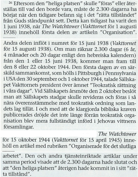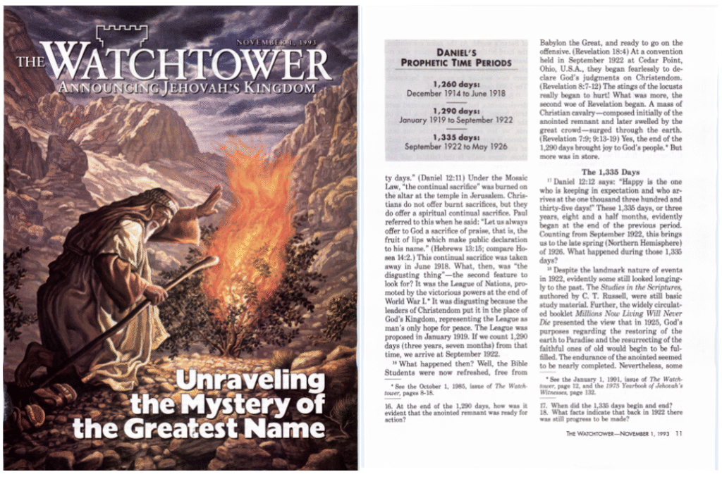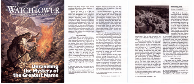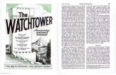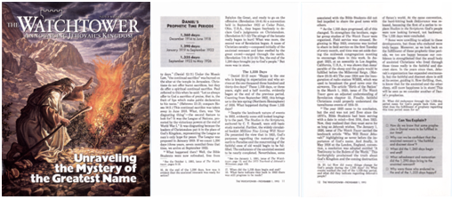 ”De 1.290 dagarna räknas därför från den tidpunkt då styggelsen ställes upp, vilket skedde under senare delen av januari 1919. Denna period på tre år och sju månader slutar i september 1922 — just den tid då det ovannämnda konventet i Cedar Point hölls.” – Vakttornet, 15 november 1951, sid. 508 (sve.) – Vakttornet, 15 juli 1951, sid. 433 (eng.)