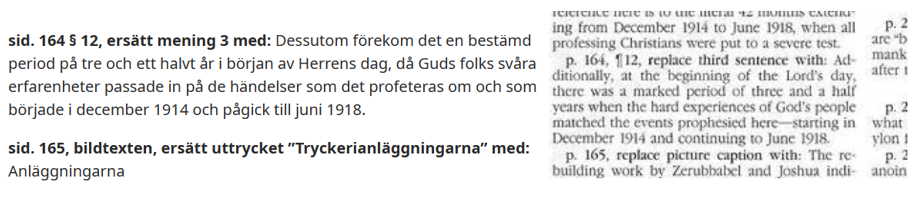 KAPITEL 24 sid. 160 § 21, rad 12, ersätt ”getlika människor” med: motståndare sid. 160 § 21, ersätt ”Matteus 25:31–34, 41, 46” med: Filipperna 1:27, 28 sid. 160, ersätt fråga 21 b) med: Varför är de goda nyheterna dåliga nyheter för motståndare? KAPITEL 25 sid. 162 § 4, ersätt fotnoten med: * Ett utförligt dryftande av detta stora andliga tempel finns i artiklarna ”Jehovas stora andliga tempel” i Vakttornet för 1 juli 1996 och ”Det enda sanna templet att tillbedja i” i Vakttornet för 15 maj 1973. sid. 162 § 5, ersätt mening 3 med: I de hebreiska skrifternas profetior innebar ett sådant mätande en garanti för att Jehova skulle visa rättvisa på grundval av sina fullkomliga normer. sid. 162 § 7, efter citatet från Uppenbarelseboken 11:2, ersätt mening 2 med: Som vi skall få se avses här de bokstavliga 42 månader som sträckte sig från december 1914 till juni 1918, då alla till bekännelsen kristna sattes på ett svårt prov. sid. 164 § 12, ersätt mening 3 med: Dessutom förekom det en bestämd period på tre och ett halvt år i början av Herrens dag, då Guds folks svåra erfarenheter passade in på de händelser som det profeteras om och som började i december 1914 och pågick till juni 1918. sid. 165, bildtexten, ersätt uttrycket ”Tryckerianläggningarna” med: Anläggningarna sid. 165 § 15, ersätt ”(Matteus 17:1–3; 25:31)” med: (Matteus 17:1–3) KAPITEL 26 sid. 175 § 12, fotnoten, ersätt ”Herodes tempel” med: templet KAPITEL 27 sid. 185, rutan, stycke 6, ersätt sista meningen med: Förföljelsen upphörde slutligen år 1970, då Jehovas vittnen, som en följd av att regeringen ändrade sin policy i fråga om icke-katolska religionssamfund, blev lagligen erkända. sid. 185 § 28, ersätt mening 2 med: I Europa blev omkring 12 000 vittnen inspärrade i nazistiska koncentrationsläger och fängelser, och omkring 2 000 dog. KAPITEL 28 sid. 187 § 4, ersätt fotnoten med: * Ytterligare detaljer ges på sidorna 165–179 i boken Ge akt på Daniels profetia!, utgiven av Jehovas vittnen. sid. 190 § 15, ersätt mening 3 med: I en enda drabbning, slaget vid floden Somme år 1916, var det 420 000 britter som dödades eller sårades jämte 194 000 fransmän och 440 000 tyskar – mer än 1 000 000 döda och sårade! sid. 192 § 22, spalt 2, rad 1, ersätt ”maj 1918” med: juni 1918 KAPITEL 29 sid. 202 § 14, mening 2, ersätt ”Guds andliga söner” med: Guds söner KAPITEL 30 sid. 206 § 3, ersätt mening 2 med: Vad hände efter år 539 f.v.t., då det forntida Babylon föll? sid. 212 § 23, ersätt ”(Matteus 13:39, 43)” med: (Matteus 13:39, 43; Johannes 15:1, 5, 16) sid. 212 § 23, stryk: Matteus 25:31–33 KAPITEL 32 sid. 231 § 27, ersätt sista meningen med: Satan ligger bakom alla sådana falska tillkännagivanden om ”Fred och säkerhet!”