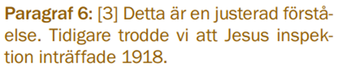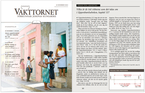 ”Hur länge pågick det här arbetet med att inspektera och rena? Det sträckte sig från 1914 till början av 1919. Den perioden inbegriper både de 1 260 dagarna (42 månader) och de symboliska tre och en halv dagarna som Uppenbarelsebokens elfte kapitel talar om.” – Vakttornet, Studieupplaga, 15 november 2014, sid. 30 (eng. & sve.)