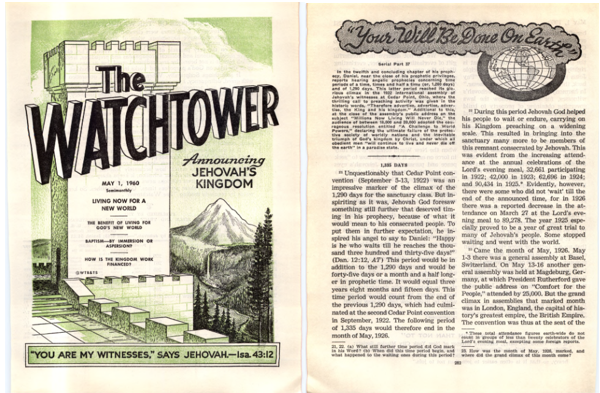 ”I det tolfte och avslutande kapitlet i sin profetiska skildring berättar Daniel, som närmade sig slutet på den tid, varunder han ägt privilegiet att tjäna såsom profet, att han hörde en ängel profetera om olika tidsperioder, en som omfattade en tid, tider och en halv tid (eller 1.260 dagar) och en annan som omfattade 1.290 dagar. Denna senare period nådde en strålande kulmen i Jehovas vittnens internationella sammankomst år 1922 i Cedar Point i Ohio, där den inspirerade maningen till predikoverksamhet blev given i dessa ord, som gått till historien: ”Därför annonsera [förkunna om], annonsera, annonsera Konungen och hans rike.” Dessutom antog de närvarande, som uppgick till mellan 18.000 och 20.000 personer, vid slutet av sammankomstens offentliga föredrag över ämnet ”Millioner som nu leva skola aldrig dö!” den frimodigt formulerade resolutionen ”Ett upprop till världens styresmän”, som framhöll det slutliga misslyckande, som skulle drabba de anordningar denna världens nationer gjort för att skapa trygghet, och bebådade den ofrånkomliga triumfen för Guds rike i Kristi händer, för det rike, under vars styrelse alla lydiga människor skall ”fortsätta att leva och aldrig dö” bort från jorden utan få njuta av paradisiska förhållanden.” – Vakttornet, 1 augusti 1960, sid. 351 (sve.) – Vakttornet, 1 maj 1960, sid. 282 (eng.)