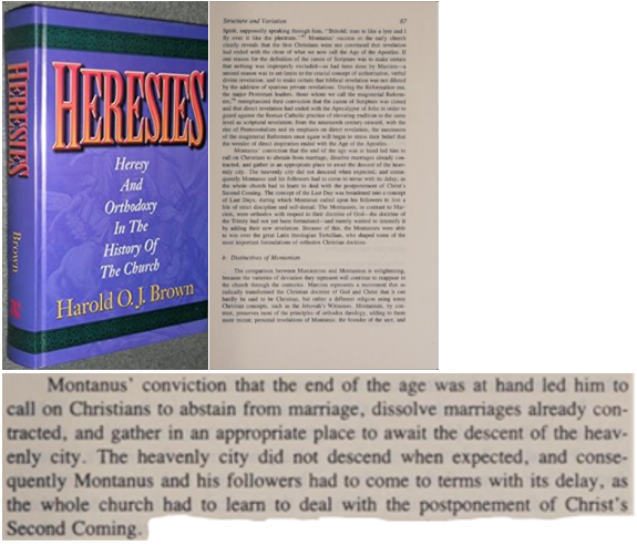 “Montanus övertygelse om att tidens slut var nära ledde till att han uppmanade kristna att avstå från äktenskap, upplösa redan ingångna äktenskap och samlas på en lämplig plats för att invänta den himmelska stadens nedfärd. Den himmelska staden kom inte ner när det förväntades, och följaktligen blev Montanus och hans anhängare tvungna att förlika sig med dess dröjsmål, eftersom hela kyrkan måste lära sig att hantera senareläggningen av Kristi andra ankomst.” [1] (Utdraget är direktöversatt)