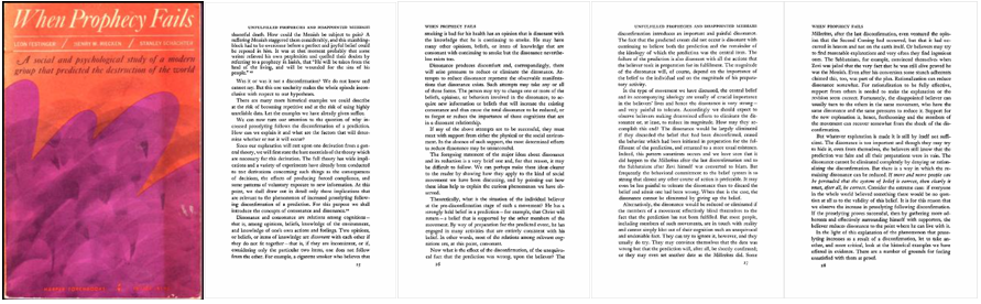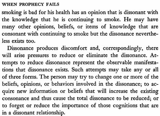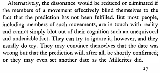 “Alternativt skulle dissonansen reduceras eller elimineras om medlemmarna i en rörelse effektivt förblindar sig för det faktum att förutsägelsen inte har uppfyllts. Men de flesta människor, inklusive medlemmar av sådana rörelser, är i kontakt med verkligheten och kan inte bara utplåna ur deras kognition ett sådant otvetydigt och obestridligt faktum, men de kan försöka ignorera det, och de försöker kanske övertyga sig själva om att datumet/tidpunkten var fel, men att förutsägelsen kommer att, trots allt, snart bli bekräftad, eller så kan de till och med ställa in sig på ett annat datum såsom milleriterna gjorde… Rationalisering kan minska dissonansen något. För att rationaliseringen ska bli fullt effektiv behövs stöd från andra för att förklaringen eller revisionen ska verka korrekt. Lyckligtvis kan den besvikna troende vanligtvis vända sig till de andra i samma rörelse, som har samma dissonans och samma tryck för att minska den. Stöd för den nya förklaringen blir såvida förestående och medlemmarna i rörelsen kan återhämta sig något från chocken av vederläggandet/diskonfirmationen.” – Leon Festinger, Henry W. Riecken och Stanley Schachter, When Prophecy Fails, (New York: Harper och Row, 1956), s. 27, 28.) (Utdraget är direktöversatt)